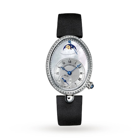 The Breguet Reine de Naples Power Reserve 8908BB/52/864D00D features a 28 x 36mm 18ct white gold case, an automatic movement with moon phase complication, and a power reserve of 40 hours. The bezel is set with 128 brilliant cut diamonds offering a total carat weight 0.83ct.