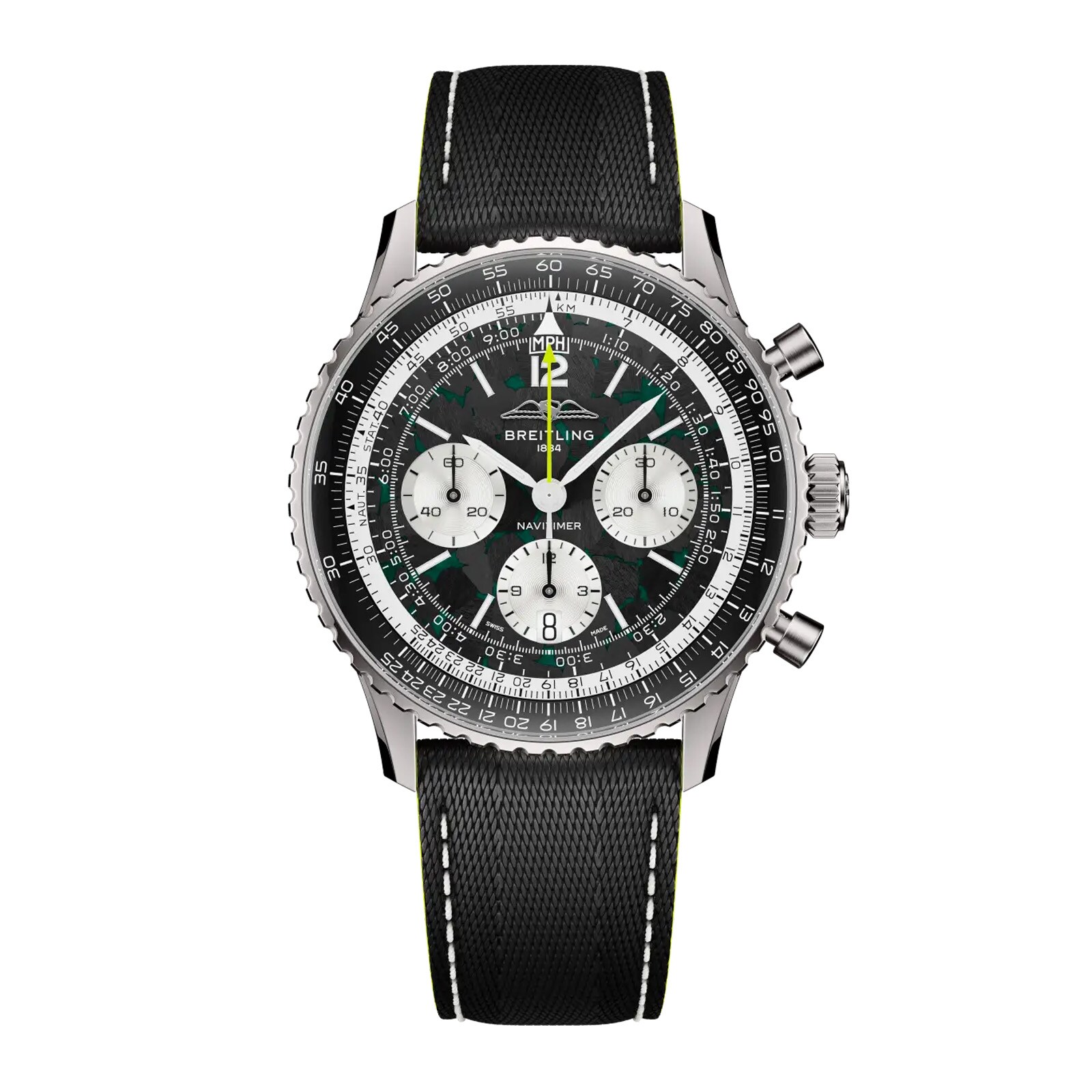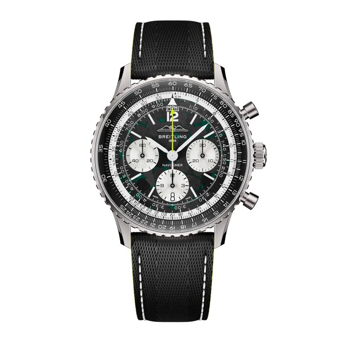The partnership between Breitling and Aston Martin Aramco Formula One™ Team comes to life in a Navitimer conceived for a world where milliseconds matter. Limited to 1,959 pieces, the Navitimer B01 Chronograph 43 Aston Martin Aramco Formula One™ Team marks the year Aston Martin entered Formula 1. It brings together race-driven materials, precision engineering, and over 70 years of Navitimer heritage. From its carbon-fiber dial and lightweight titanium case to details inspired by the cockpit of an F1 car, every element is designed for absolute timing accuracy under pressure. Turning the watch over reveals its engine, the Breitling Manufacture Caliber 01, fitted with a specially developed matte-black rotor bearing the Aston Martin Aramco logo. Originally developed as a pilot’s instrument, with a circular slide rule for real-time calculations, the Navitimer made its way from sky to circuit, worn by drivers who demanded the same precision on the track.