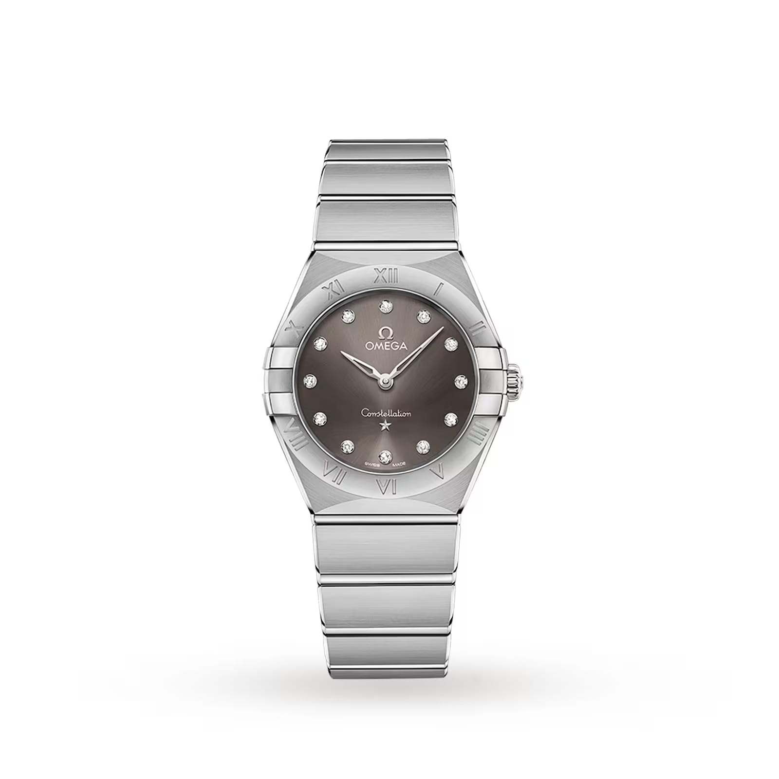 The sun-brushed grey dial exudes elegance with 18K white gold hands and sparkling diamond hour markers. Inspired by the original Constellation models, the bezel is engraved with Roman numerals, while the 4061 calibre Quartz movement offers flawless precision.