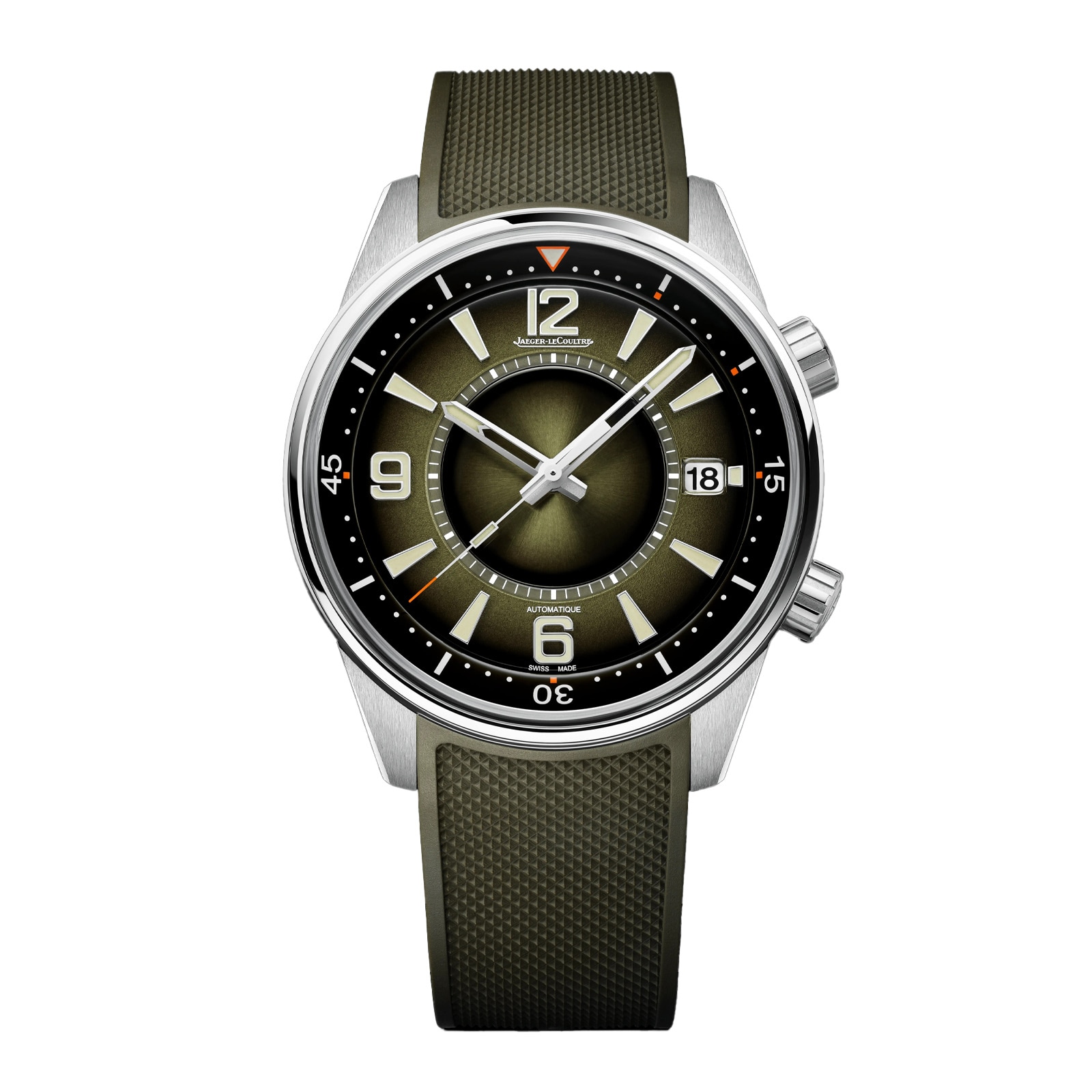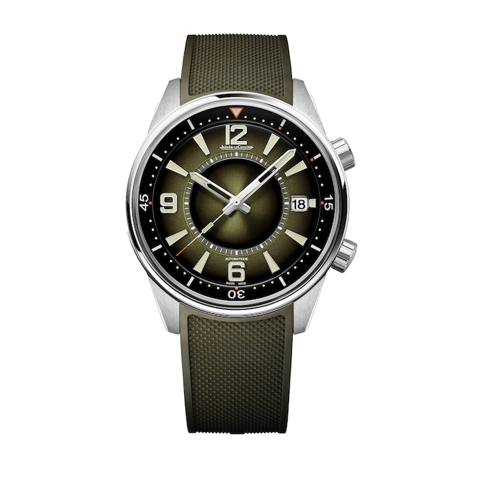 For the first time, the lacquered face of the Polaris Date watch sports a green that is as deep as it is subtle. Depending on the play of light, the color evolves and transforms from a contrasting dark green to a soft, luminous hue. With its innovative décor, the Super-LumiNova® hour markers and numerals stand out in all their brilliance alongside the skeletonized hands with luminescent tips. Paying homage to the first Memovox Polaris, the vanilla tone of their finish further enhances their striking visual appeal. The sharp lined, 42-mm stainless steel case boasts a double-polished satin finish and is complemented by an easily interchangeable green rubber strap with a Clous de Paris motif. The sapphire crystal case back reveals the finishes of the new generation Jaeger-LeCoultre Calibre 899. Designed, produced and assembled under the same roof, this Manufacture movement offers a 70-hour power reserve, a highly practical feature for a sports watch.