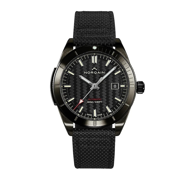This 42mm automatic-winding Adventure Sport timepiece features the NORQAIN pattern on its black dial, complete with stainless steel and diamond-like carbon (DLC) coating. Powering this watch is the NORQAIN caliber NN09, visible through caseback.