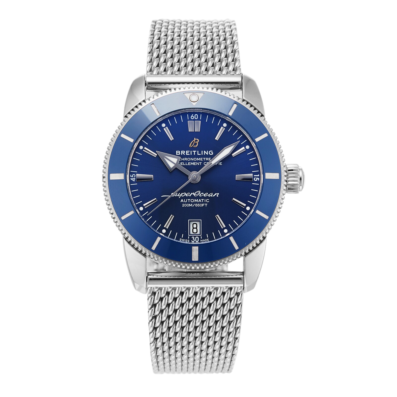 This Pre-Owned Breitling Superocean Heritage B20 42 Mens Watch AB2010161C1A1 features a 42mm stainless steel case fitted with a blue dial, sapphire crystal glass, and a date complication.