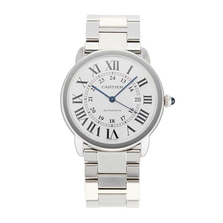 This Pre-Owned Cartier Ronde Solo de Cartier 42 Mens Watch W6701011 features a 42mm (approximate size) stainless steel case fitted with a silver dial, sapphire crystal glass, and a date complication.