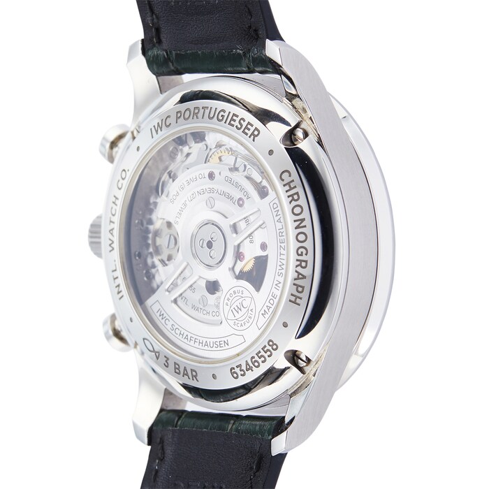 This Pre-Owned IWC Portugieser Chronograph Mens Watch IW371615 features a 41mm stainless steel case fitted with a green dial, sapphire crystal glass, and a chronograph complication.