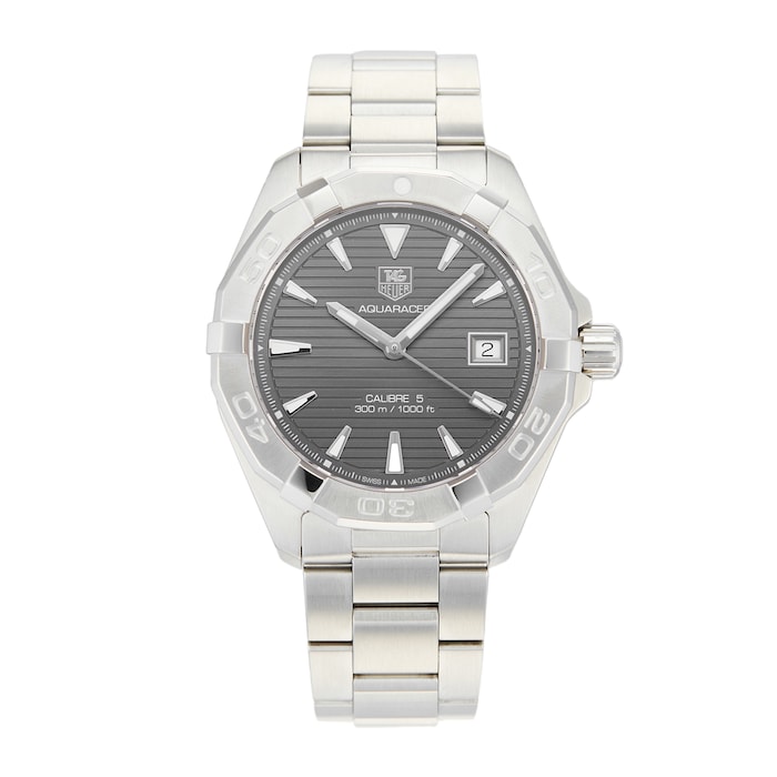 This Pre-Owned TAG Heuer Aquaracer Calibre 5 Men's Watch WAY2113.BA0928 features a 41mm stainless steel case fitted with a grey dial, sapphire crystal glass, and a date complication.