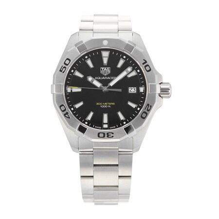 This Pre-Owned TAG Heuer Aquaracer Mens Watch WBD1110.BA0928 features a 41mm (approximate size) stainless steel case fitted with a black dial, sapphire crystal glass, and a date complication.