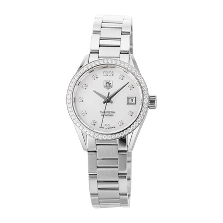 This Pre-Owned TAG Heuer Carrera Ladies Watch WAR2415.BA0776 features a 28mm Stainless Steel case, showcasing a White Mother of Pearl dial and sapphire crystal glass. Powered by an Automatic movement, this stunning watch also showcases a Stainless Steel bracelet finished with a Folding Clasp for added security. This timepiece is also water resistant to 100 metres