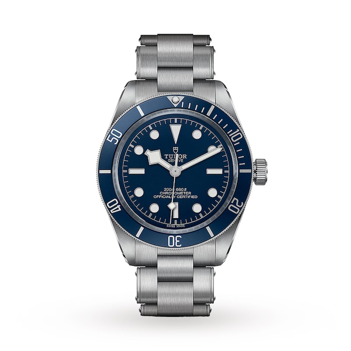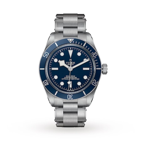 Offering a sporty yet sophisticated look, this Tudor Black Bay Watch showcases a bold blue dial and unidirectional rotatable bezel in steel with 60-minute graduated disc in matt blue anodised aluminium and silver gilded markings and numerals.