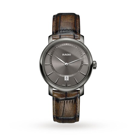 Smart and sophisticated, this charming Rado DiaMaster watch sits confidently within a 40mm grey plasma high-tech ceramic case and fastens securely with a brown leather strap.