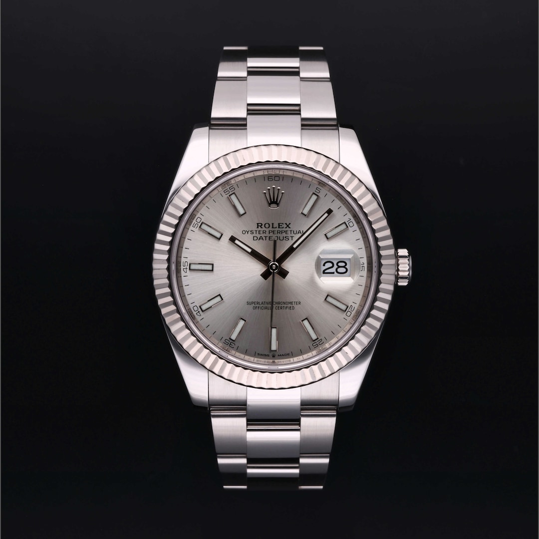 This 41mm reference 126334 features a silver dial and a fluted bezel in white gold. Powered by the Calibre 3235 with a 70-hour power reserve, it is paired with the Oyster bracelet for a sophisticated finish.