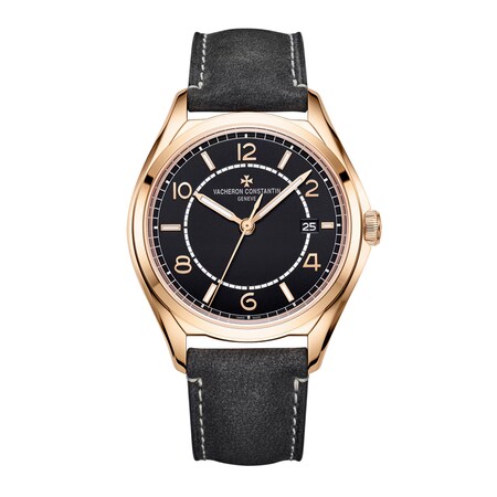 With its retro-contemporary look, box-type crystal and sector dial, this timepiece takes inspiration from watches from the 1950s. The black dial goes perfectly with the 18K 5N pink gold case and features an authentic anthracite nubuck calfskin-leather strap. Visible through the sapphire back, its self-winding mechanical movement displays the Cotes de Geneve finishing and an oscillating weight in 22K pink gold, whose shape is inspired by the Maltese cross.