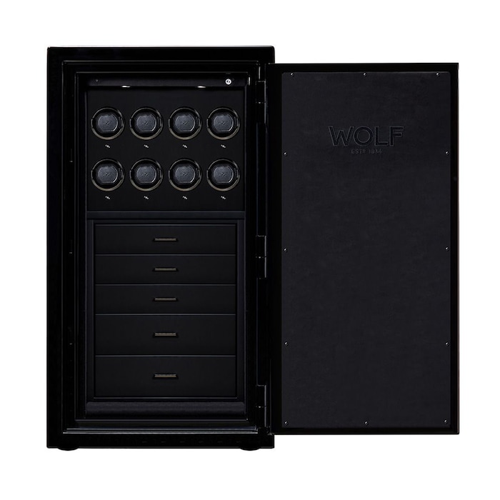The ultimate in security for your watches, jewelry & valuables. Forged in American steel, UL tested and certified for burglary & fire, the Atlas is an impenetrable fortress. Painted steel polished to a mirror finish, drawers lined with LusterLoc™ treated fabrics that stop tarnishing for 35 years. Watch winders are controlled by WOLF’s Bluetooth connected App. Control one or all winders at the same time.