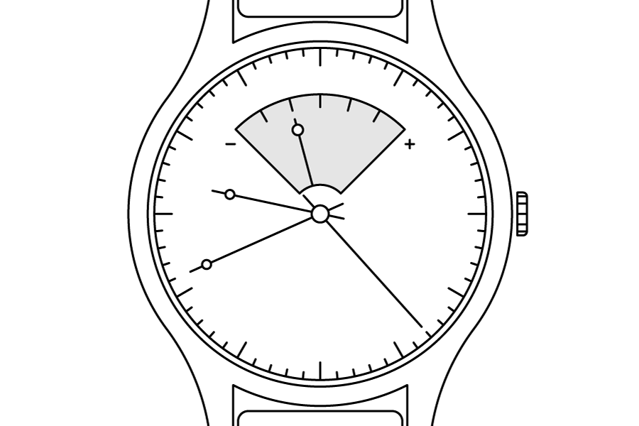 The equation of time calendar shows the difference between the time on a watch and solar time. This varies between approximately -14 minutes to +16 minutes, depending on the current month. Put simply, it’s as if looking at a watch and a sundial, and seeing the variance between both.